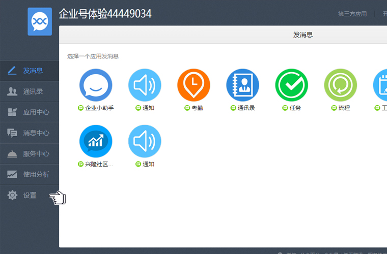 访问 ”微信企业号”官网(https://qy.weixin.qq.com) ,进入页面,选择【设置】;