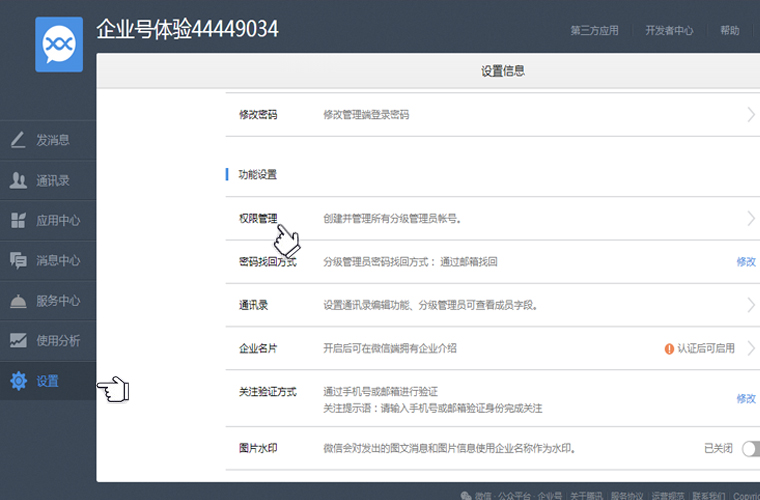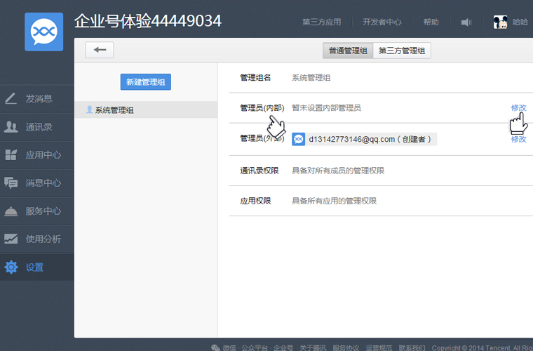 1、 ”微信企业号”(注册)的用户帐号必须有【管理员(内部)】的权限;