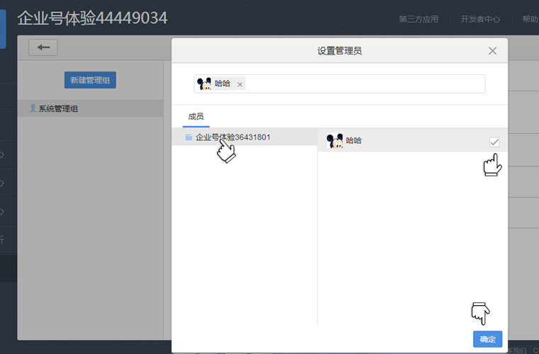 设置管理员页面,点击图中“成员”下的“自己的帐号”在右边的选择框勾选上,点击下面的“确定”按钮;